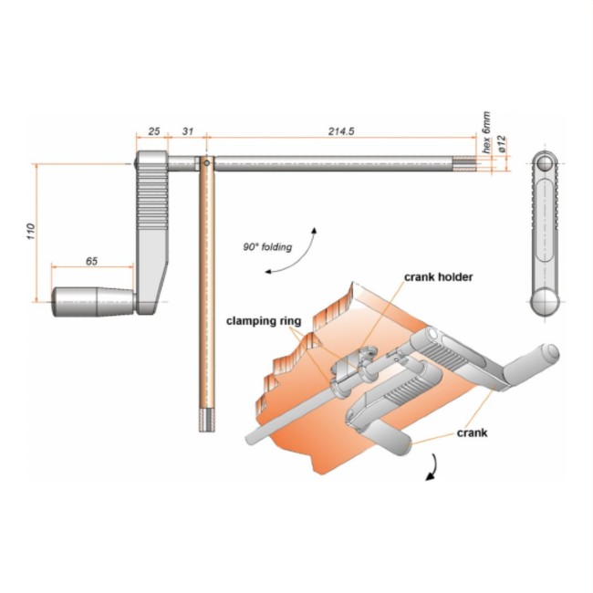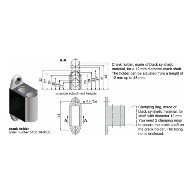 De zwengelhouder is gemaakt van zwart synthetisch materiaal, voor een krukas met een diameter van 12 mm. De houder kan worden aangepast naar een hoogte van 12 mm tot 45 mm.